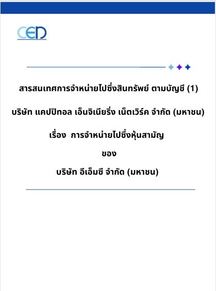 | 04 Apr 2022 | - | 05 Apr 2022 | 29 เม.ย. 2565 14:00 | Cash dividend payment,Capital increase | AGM | Via Electronic Media (E-Meeting) at Capital Engineering Network Public Company Limited, 1011 Supalai Grand Tower, 17th Floor, Room No.1703, 1704, Rama 3 Road, Chongnonsi, Yannawa Bangkok |